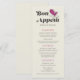 Estes menus de janto de casamento de 4 x 9", estilo de safra, apresentam uma inscrição negra com um título estilizado, "Bon Appetit", em letras grandes, com um sotaque cardíaco magenta sobre fundo creme. O menu tem espaços reservados para 2 aperitivos, 2 entradas e 2 sobremesas e os nomes dos casais de casamento.