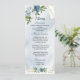 lindas flores azuis e brancas e verdes deixam cardápio romântico de casamento.