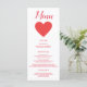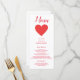 Um bonito coração vermelho, este cardápio de recepção de casamento apresenta um lindo fundo branco com uma fonte vermelha. Com o "Menu" escrito no topo usando a fonte vermelha cursiva, todas as suas informações são impressas em uma fonte legível a rosa sobre um fundo branco. Personalize como quiser. Coração: Clipart: AMBilustrações http://www.etsy.com/shop/AMBillustrations/