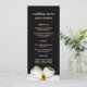 Menu bonito do casamento com as duas pias batismais diferentes em três cores pastel, e uma magnólia branca em um fundo preto.