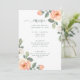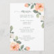 Este lindo cartão de cardápio de casamento apresenta pêssego moderno e flores brancas com muitas folhas verdes, e tipografia moderna em um fundo branco limpo.