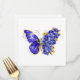 Borboleta de flores cinza, azul, safira, espumante com asa decorada com flores preciosos azuis com folhas de ouro sobre fundo branco.