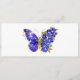 Borboleta de flores cinza, azul, safira, espumante com asa decorada com flores preciosos azuis com folhas de ouro sobre fundo branco.