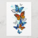 Borboleta azul-clara e voadora morfo e borboleta-monarca laranja num fundo branco. Morpho. Borboleta monarca. Design com borboletas.