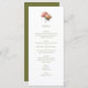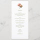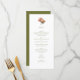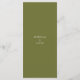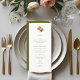 Na moda e chic com apelo minimalista. Este cardápio de casamento apresenta um belo buquê de rosa floral ao lado de um conjunto contemporâneo de fontes em verde-oliva, contra o fundo branco e de azeitona.