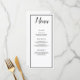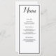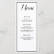 Um menu clássico branco e preto, este menu de recepção de casamento apresenta um fundo branco adorável com uma fonte preta. Com "Menu" escrito no topo usando uma fonte preta cursiva, todas as suas informações são impressas em uma fonte preta legível sobre um fundo branco. Personalize como quiser.