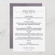 Este menu de casamento é simples, mas elegante. Apresenta caligrafia roxa rico e marinho azul empoeirada com a palavra "Menu" no topo e os nomes do casal e da data do casamento abaixo. A parte de trás é uma cor de lavanda empoeirada. Perfeito por adicionar um toque de classe à sua recepção de casamento.