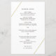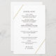 Menu de casamento geométrico moderno com duas linhas de ouro, uma em cima à esquerda e uma em baixo à direita sobre um fundo branco. Um design minimalista que ainda aparece como chic e na moda. Esses menus baratos de casamento são impressos em folhas de papel para uma opção econômica.