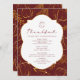 Elegante rústico obrigado menu de janto de feriado de Ação de Graças com tons burgundy e cor de laranja quente contorno de folhas de outono e padrão de abóboras.