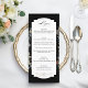 Este design de menus chic apresenta uma vida estéreal floral holandesa do século XVIII, incluindo tulipas brancas, vermelhas e douradas e flores silvestres, sobre um fundo preto com etiqueta central personalizada, gráficos florais complementares e caligrafia personalizada elegante. O dorso apresenta uma coroa floral opcional com modelo de monograma.