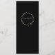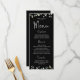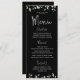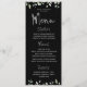 Um cardápio preto com caligrafia prateada com caligrafia manuscrita para os títulos e uma pequena fonte para o corpo com seus nomes na dentro de trás de um galho e coroa.