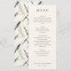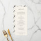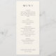 Este elegante cardápio de casamento apresenta um design minimalista com linhas limpas e amplo espaço em branco, criando uma aparência sofisticada e refinada. A paleta de cores é simples, usando texto preto em um fundo bege para alto contraste e legibilidade. A tipografia desempenha um papel fundamental, com fontes serifadas em negrito destacando os cabeçalhos das seções e uma fonte sans-serif elegante listando os itens do cardápio, que incluem opções de entradas, saladas, prato principal e sobremesas. O clima geral é clássico e formal, perfeito para um evento sofisticado, enquanto o layout direto garante clareza e facilidade de leitura.