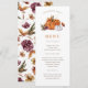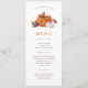 Cardápio de Abóbora de Ação de Graças. Este cardápio de jantar de Ação de Graças com abóbora de outono fofo e elegante apresenta belas flores de outono e abóboras laranja queimado e brancas em aquarela com um padrão caprichoso no verso.