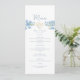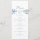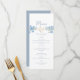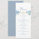 Menu de casamento azul empoeirado elegante com coração de corda dourada, flores silvestres pervinca, monograma e letra cursiva simples.