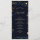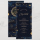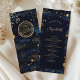 Adicione um toque de magia à sua recepção com este cardápio de casamento temático celestial, apresentando o nome de cada convidado em escrita elegante. O fundo azul-marinho profundo é adornado com estrelas douradas, luas e constelações, criando uma estética sonhadora de céu noturno. Um arco gracioso emoldura o nome personalizado e os detalhes do cardápio em fontes serifadas refinadas e caligrafia. Ideal para casamentos noturnos, celebrações de observadores de estrelas ou eventos inspirados na astrologia, este cardápio funciona como um marcador de lugar único e lembrança. Totalmente editável para nomes de convidados e detalhes dos pratos.