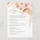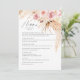 Cardápio de jantar de casamento em aquarela Boho floral com grama Pampas. Belo padrão de flores botânicas cor-de-rosa na parte de trás do cartão. Este cartão de jantar de casamento é a escolha perfeita para ser colocado em cima do prato de casamento para um casamento temático boho.