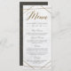 Crie seus próprios cartões de cardápio de casamento personalizados em Mármore Art Déco Geométrico Dourado Moderno com esses modelos fáceis de usar da WowWed. Esses cartões de cardápio geométricos apresentam caligrafia dourada falsa, fundo de mármore branco e tipografia elegante. No verso, há um padrão geométrico dourado em um fundo cinza.