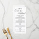 Cartão de cardápio de casamento simples em preto e branco com letra de assinatura elegante, apresentando nomes em estilo de assinatura, este cardápio moderno pode ser personalizado com seus detalhes em letras pretas elegantes. Criado por Thisisnotme©