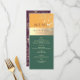 Simples, caligrafia, moderno, elegante, tons de joia, verde esmeralda, amarelo e roxo ameixa cardápio de casamento com renda floral dourada.
