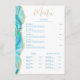 Outro menu de restaurante elegante do Blue Sands Studio. Este menu moderno apresenta um design de aquarela azul aqua com detalhes de brilho dourado falso. Lembrando a pedra de ágata. Fontes serif clássicas são combinadas com caligrafia fluida. Modelo facilmente editável para inserir suas seções e itens do menu. Organizado em Pratos Principais, Acompanhamentos, Sopa & Salada e Sobremesa. Se precisar de ajuda ou conselho, por favor envie-me uma mensagem Zazzle.