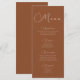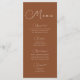 Este cardápio é caracterizado pelo estilo boho, cores terracota e bege, com uma mistura de diferentes estilos de fonte, muitas vezes em tamanhos diferentes, para criar uma aparência única e eclética que torna esses cardápios uma estética natural.