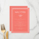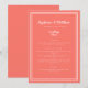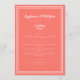 Cardápio de Casamento simples, minimalista e elegante apresenta um design contemporâneo com uma moldura dupla em borda branca crocante em um fundo CORAL VIVO. A redação tradicional fornece sofisticação atemporal e moderna. Personalize o design do casamento com os detalhes do seu cardápio em letras brancas e caligrafia. O verso do cartão combina com o coral sólido correspondente.
