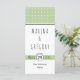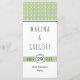 Um cartão de cardápio moderno de tipografia verde-sábio que apresenta um padrão geométrico branco no sábio e uma faixa com a data do casamento.