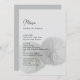 Modelo de cardápio moderno, de areia dólares. Tonalidades de cinza neutra e texto preto. O texto se alinha ao lado esquerdo com o título "Menu" e os nomes da noiva e do noivo. Todas as seleções de menu são adicionadas em um parágrafo. Duas grandes imagens de areia branca são o fundo. O reverso é uma cor de cinza mais escura.