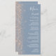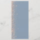 A borda esquerda deste elegante cardápio moderno de casamento apresenta um design de brilho de pêssego. O texto personalizável combina manuscrito branco, fontes em copperplate e itálico em um fundo azul empoeirado. O verso apresenta um design de brilho azul empoeirado e cor de pêssego.
