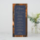 Este elegante e moderno menu de casamento mostra uma cor-de-água queimada, cor de laranja, e o fundo cortado com brilho dourado. O texto aparece em letras elegantes douradas e fontes sans serif em um retângulo azul marinho. O design de ágata é repetido no reverso.