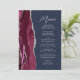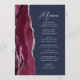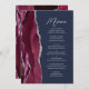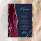 Este elegante cardápio moderno de casamento apresenta uma cor vermelha e borrifada, borda agitada com falso brilho prateado. O texto personalizável combina o script de escrita manual de cinzas prateadas e as fontes sans serif em um fundo azul marinho. O design de burgata e agata prateada é repetido do lado oposto.