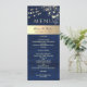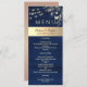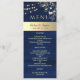 Ponha o tom para a sua celebração com este cardápio de janto de casamento azul e dourado com marinho rústico. Com luzes brilhantes de cordas e delicados sotaques florais, este elegante design combina calor e romance — perfeito para casamentos no inverno, recepções de celeiro ou eventos noturnos. Personalize facilmente o menu com os seus cursos de casamento para corresponder ao seu estilo e tema pessoais. Uma maneira encantadora de adicionar sofisticação à sua cola de sopa.