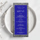 Adicione um toque de luxo ao seu reception com este menu de casamento azul real e prata brilhante. Projetado com tipografia moderna e limpa e acentos prateados cintilantes, exala sofisticação e estilo. Perfeito para casamentos de inverno ou celebrações formais noturnas, este menu complementa lindamente a sua mesa sofisticada enquanto guia os convidados através da refeição cuidadosamente selecionada.