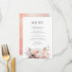 Apresentando o cardápio romântico que elevará a decoração do seu sonho! Este cartão de cardápio de cor-de-rosa e pêssego floral é a adição perfeita a qualquer evento ou tema, infundindo sua mesa com um toque de elegância e graça naturais. Torne sua ocasião realmente inesquecível com este cartão de menu elegante que levará seus hóspedes em uma jornada de encanto e maravilha!