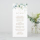 Este menu de casamento apresenta cores aquáticas pintadas de eucalipto, folhas botânicas verdes e douradas com guião dourado.