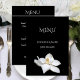 White Magnolia Black and White Card, Menu Casamento, projetada com uma flor branca brilhante de magnólia no cobrir. O texto da frente inclui: Menu, Nomes da Noiva e da Noite e Data de Casamento. O texto inverso inclui: Menu, Seu Apetista, Entre e Selecionar Seleções. Para personalizar, basta inserir seus detalhes em nosso modelo fácil, substituindo as amostras. Certifique-se de ver a Coleção de Casamentos da Magnolia Branca completa para cartas e acessórios correspondentes.