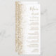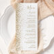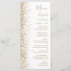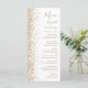 A borda esquerda deste elegante cardápio moderno de casamento apresenta um design de brilho dourado. O texto personalizável combina manuscrito dourado, fontes em copperplate e itálico em um fundo branco. O verso apresenta um design de brilho branco e dourado correspondente.