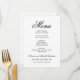 O design de cardápio de casamento branco e preto apresenta uma bela tipografia que combina um tradicional roteiro de caligrafia florescida com carateres clássicos de bloqueio num fundo branco limpo. Inclui um sotaque de design de rolagem decorativo. O texto personalizado pode ser personalizado com um monograma dos nomes da noiva e noiva e da data do casamento, bem como os detalhes do menu janto para o dia do casamento. Por favor, compre nossa Coleção de Casamentos Brancos e Pretos Elegantes Clássicos para coordenar designs.