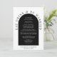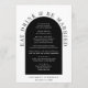 Menu de casamento moderno e chic com "Coma Bebida e Seja Casado" em tipografia elegante serif, seu cardápio em uma simples tipografia branca dentro de um quadro de arco negro, e seus nomes e data de casamento.