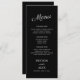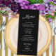 Elegante cardápio de casamento preto com texto branco. Personalize com os nomes da noiva e do noivo e sua data de casamento.