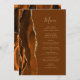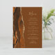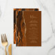 A borda esquerda deste elegante menu de casamento moderno apresenta uma borda agitada em tons de ferrugem e laranja queimada, aparada com falso brilho dourado. O texto personalizável combina um script de escrita manual dourado e fontes de impressão em fundo marrom-noz. O verso apresenta uma ferrugem e um design de agate dourado correspondentes.