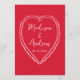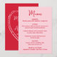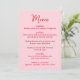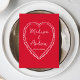 Compartilhe o cardápio da recepção com estilo com este cartão de menu de casamento caprichoso, projetado para combinar com papelaria de casamento moderna e divertida. A frente do cardápio apresenta “Menu” exibido em um script vermelho manuscrito com os detalhes do cardápio do casamento mostrados abaixo em um fundo rosa, tornando-o um charmoso complemento para os arranjos de mesa ou mesas de recepção. A parte de trás do cartão de menu de casamento apresenta um coração rosa desenhado à mão em torno dos nomes do casal e da data do casamento para uma aparência coesa e personalizada. Perfeito para casamentos no Dia dos Namorados, casamentos em fevereiro e celebrações românticas, este cardápio de recepção de casamento personalizável adiciona personalidade, ao mesmo tempo em que ajuda os convidados a visualizar facilmente o cardápio em sua recepção.