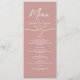 Menu de casamento elegante e moderno, poeirento, com tipografia branca-quic, um motif de corda-ouro romântico e um layout limpo. Perfeito para casamentos com temas pastel, minimalista ou rosa e ouro. Este design combina com primavera, verão, ou cai recepções e adiciona um toque refinado à decoração da sua mesa. Totalmente personalizável com seus detalhes de refeição e data de casamento.