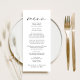 Menu Chic para sua recepção de casamento, festa de noivado, janto de ensaio e outras celebrações com "menu" em uma escrita moderna, seu menu personalizado em uma simples tipografia, e seus primeiros nomes e data de evento em uma elegante tipografia serif.