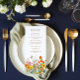 O Menu de Casamento do País das Flores Selvagens Coloridas apresenta flores bonito em cor laranja, amarela, roxa e rosa sobre um fundo branco com o menu personalizado acima. Personalize editando o texto nas caixas de texto. Projetado para você por ©Evco Studio www.zazzle.com/store/evcostudio