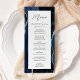 Este elegante e moderno menu de casamento mostra um marinho azul de aquarela de fundo, aparado com brilho de prata. O texto aparece na escrita elegante de cinzas de carvão vegetal e sans serif fonts em um retângulo branco. O design de ágata é repetido no reverso.