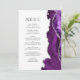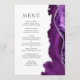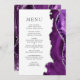 A borda direita deste elegante menu de casamento moderno apresenta uma cor d'água púrpura e borda agitada com falso brilho prateado. O texto personalizável combina as fontes de serif romana e copperplate de cinza de carvão em um fundo branco. O verso apresenta um design de agata prateado e roxo correspondente.