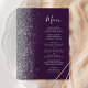 A borda esquerda deste elegante cardápio moderno de casamento apresenta uma falsa borda cintilante prateada. O texto personalizável combina o script de escrita manual de cinzas prateadas e as fontes em um fundo roxo escuro. O verso apresenta um design de brilho roxo e prateado correspondente.