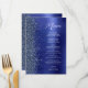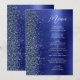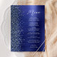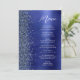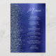 Este menu de casamento moderno e elegante apresenta uma borda de brilho de diamante falso em um fundo de metal polido falso azul naval. O texto personalizável combina letra manuscrita branca e fontes sem serifa. O design de metal polido e brilho azul naval é repetido no verso.