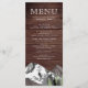 Cartão de cardápio rústico elegante com montanhas bonitas de neve e pinheiros com tipografia moderna contra um fundo de madeira de celeiro.